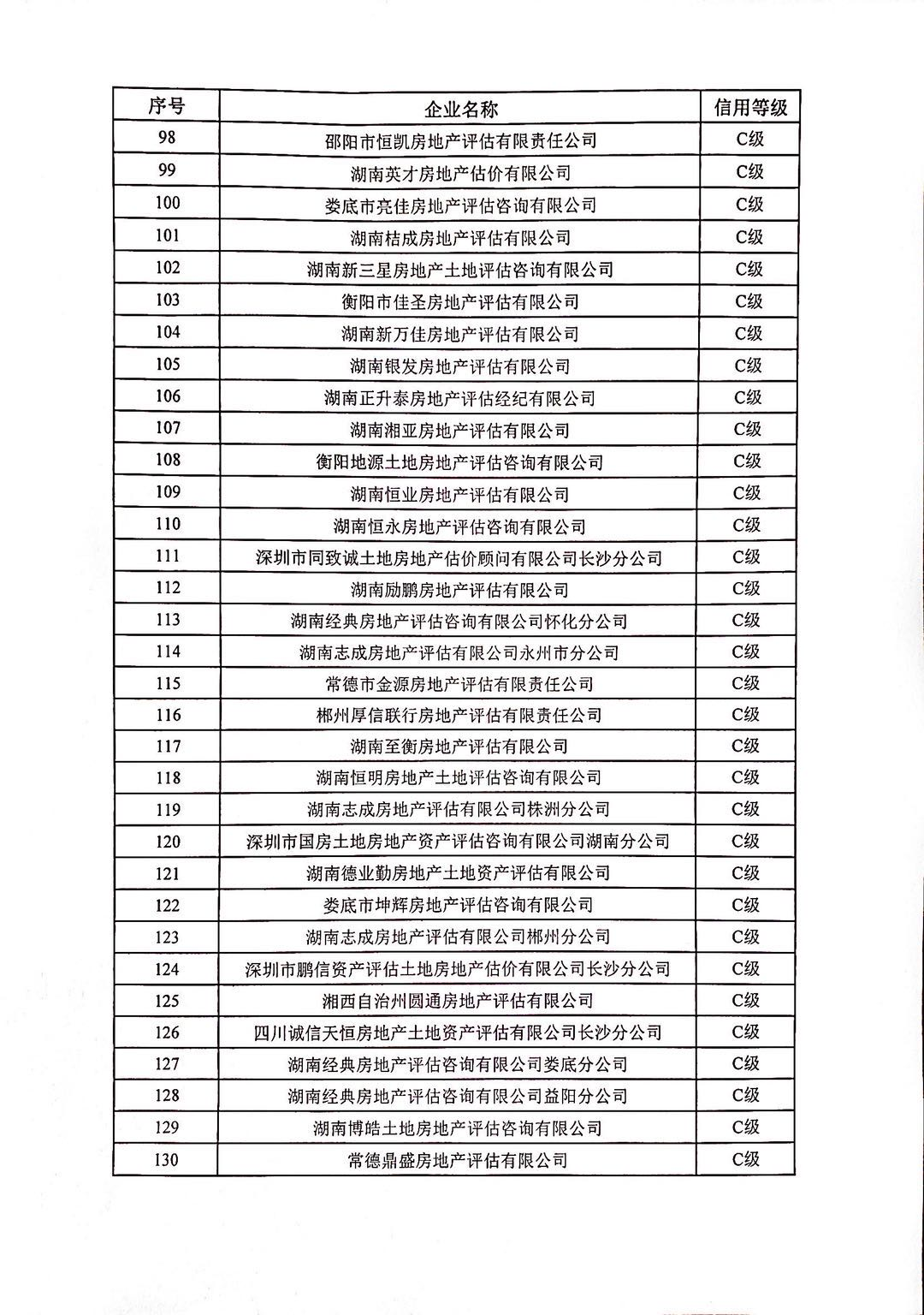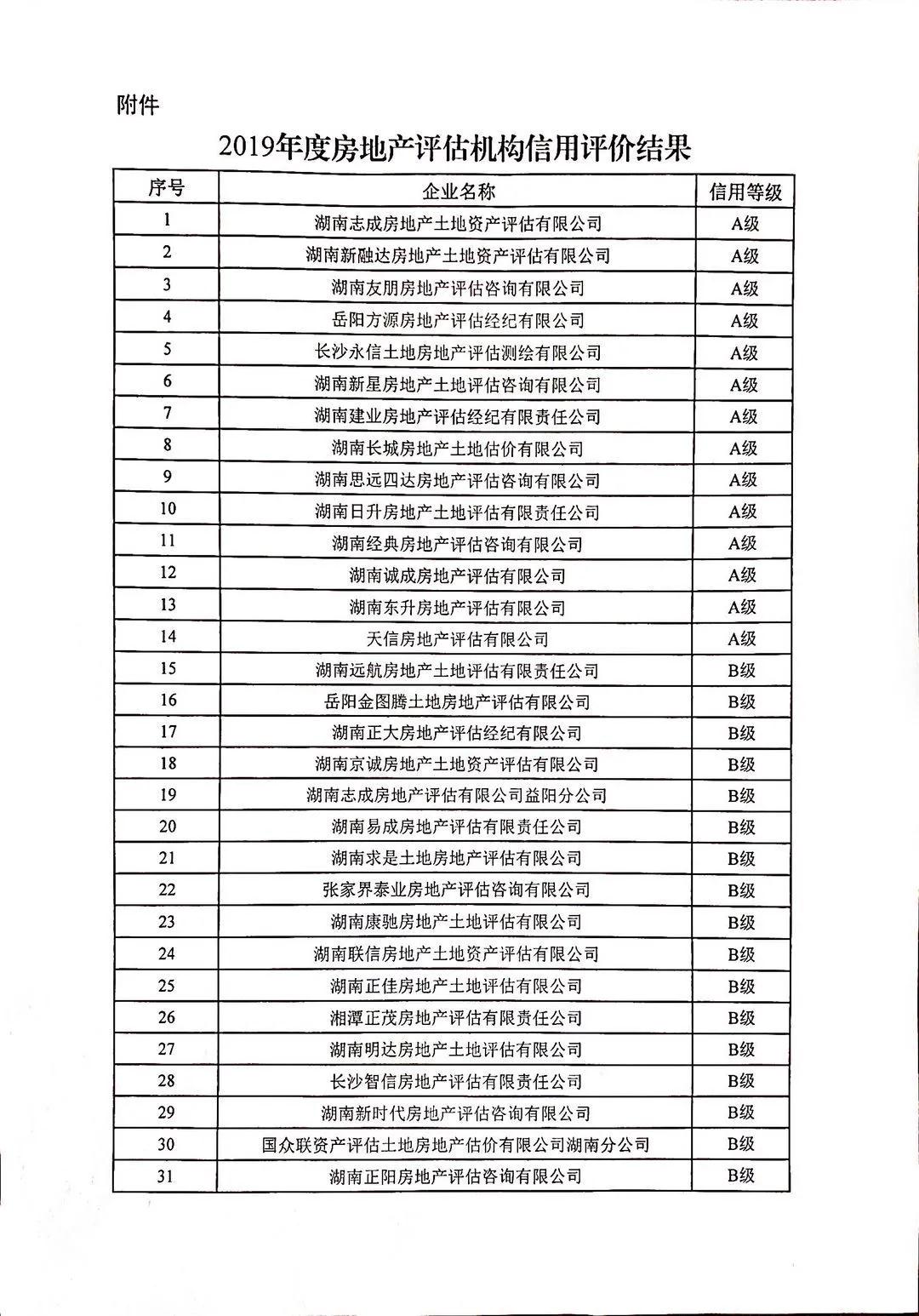 根據《湖南省房地產業協會房地產行業信用評價管理辦法(試行)》(湘房協〔2018〕15號)相關規定,我會按程序對全省158家評估機構進行信用評價,其中信用等級為A級的企業14家,信用等級為B級的企業53家,信用等級為C級的企業76家,信用等級為D級的企業6家,無等級9家,現予公布。