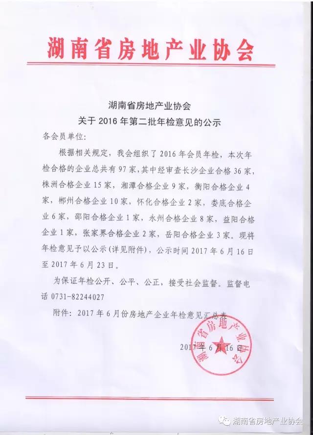 湖南省房地產(chǎn)業(yè)協(xié)會關于2016年第二批年檢意見的公示