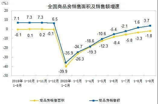 國家統(tǒng)計(jì)局今日(10月19日)公布的《2020年1-9月份全國房地產(chǎn)開發(fā)投資和銷售情況》顯示,1-9月份全國房地產(chǎn)開發(fā)投資103484億元,同比增長5.6%,增速比1-8月份提高1.0個(gè)百分點(diǎn);商品房銷售面積117073萬平方米,同比下降1.8%,降幅比1-8月份收窄1.5個(gè)百分點(diǎn);商品房銷售額115647億元,增長3.7%,增速提高2.1個(gè)百分點(diǎn)。