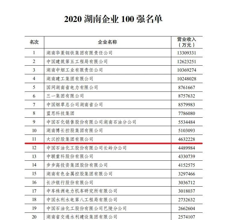 最新消息,11月5日上午,2020年湖南企業(yè)家活動(dòng)日暨企業(yè)家年會(huì)上發(fā)布了湖南企業(yè)100強(qiáng)名單,省房協(xié)會(huì)長(zhǎng)單位大漢控股集團(tuán)有限公司榮列2020湖南企業(yè)100強(qiáng)第11位,湖南服務(wù)業(yè)企業(yè)50強(qiáng)第3位。