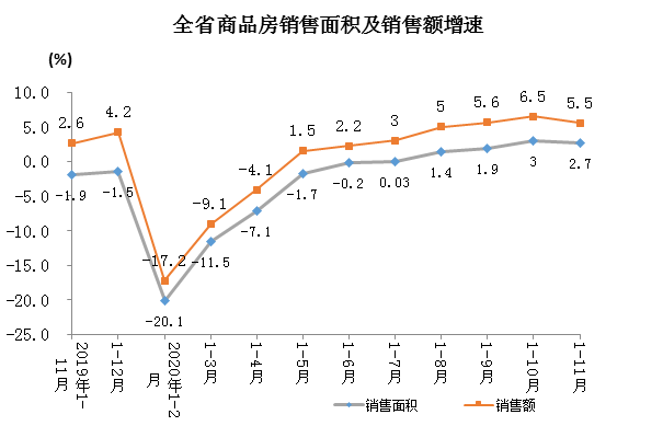 1-11月,全省商品房銷(xiāo)售面積7899.44萬(wàn)平方米,同比增長(zhǎng)2.7%,去年同期為下降1.9%。其中,住宅銷(xiāo)售面積增長(zhǎng)4.8%,辦公樓銷(xiāo)售面積下降12.5%,商業(yè)營(yíng)業(yè)用房銷(xiāo)售面積下降15.7%。商品房銷(xiāo)售額4945.31億元,增長(zhǎng)5.5%。其中,住宅銷(xiāo)售額增長(zhǎng)10.1%,辦公樓銷(xiāo)售額下降24.6%,商業(yè)營(yíng)業(yè)用房銷(xiāo)售額下降23.2%。