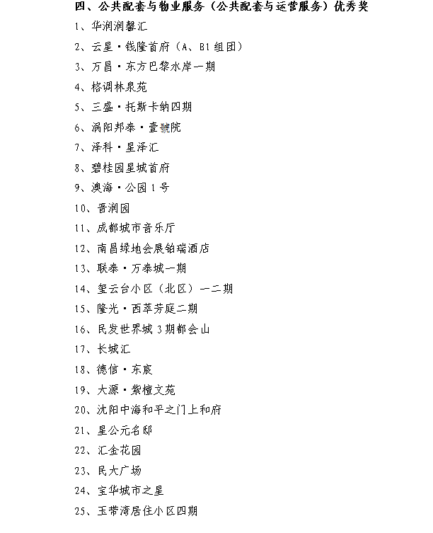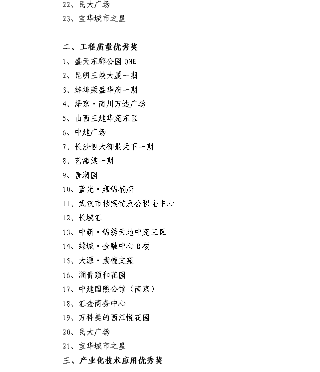 其中中建廣場、長沙恒大御景天下一期、中國鐵建?洋湖苑、澳海?公園1號、碧桂園星城首府五個項目在規劃與建筑設計、工程質量、產業化技術應用、公共配套與物業服務(公共配套與運營服務)方面表現突出,同時被授予單項優秀獎。