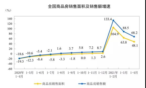 1—4月份,商品房銷售面積50305萬平方米,同比增長48.1%;比2019年1—4月份增長19.5%,兩年平均增長9.3%。其中,住宅銷售面積增長51.1%,辦公樓銷售面積增長20.0%,商業營業用房銷售面積增長16.3%。商品房銷售額53609億元,增長68.2%;比2019年1—4月份增長37.0%,兩年平均增長17.0%。其中,住宅銷售額增長73.2%,辦公樓銷售額增長31.9%,商業營業用房銷售額增長20.3%。