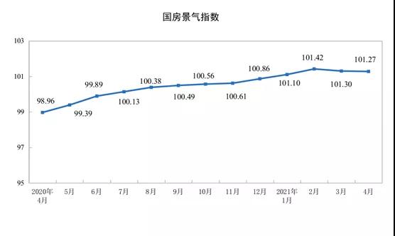 4月份,房地產開發景氣指數(簡稱“國房景氣指數”)為101.27。
