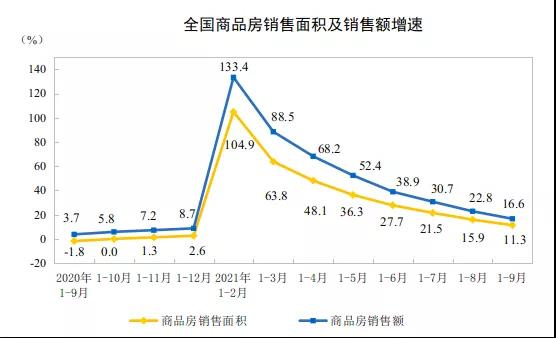 1—9月份,商品房銷售面積130332萬平方米,同比增長11.3%;比2019年1—9月份增長9.4%,兩年平均增長4.6%。其中,住宅銷售面積增長11.4%,辦公樓銷售面積增長3.1%,商業(yè)營業(yè)用房銷售面積增長0.7%。商品房銷售額134795億元,增長16.6%;比2019年1—9月份增長20.9%,兩年平均增長10.0%。其中,住宅銷售額增長17.8%,辦公樓銷售額增長0.5%,商業(yè)營業(yè)用房銷售額增長0.5%。