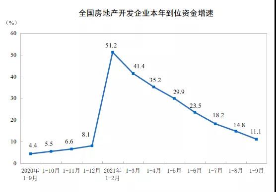 1—9月份,房地產(chǎn)開發(fā)企業(yè)到位資金151486億元,同比增長11.1%;比2019年1—9月份增長16.0%,兩年平均增長7.7%。其中,國內(nèi)貸款18770億元,下降8.4%;利用外資59億元,下降36.9%;自籌資金47212億元,增長6.1%;定金及預(yù)收款56689億元,增長25.6%;個人按揭貸款24124億元,增長10.7%。