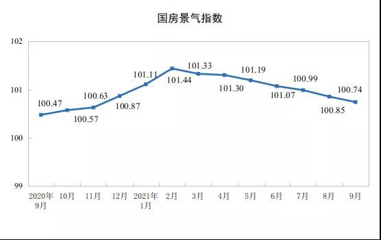 9月份,房地產(chǎn)開發(fā)景氣指數(shù)(簡稱“國房景氣指數(shù)”)為100.74。