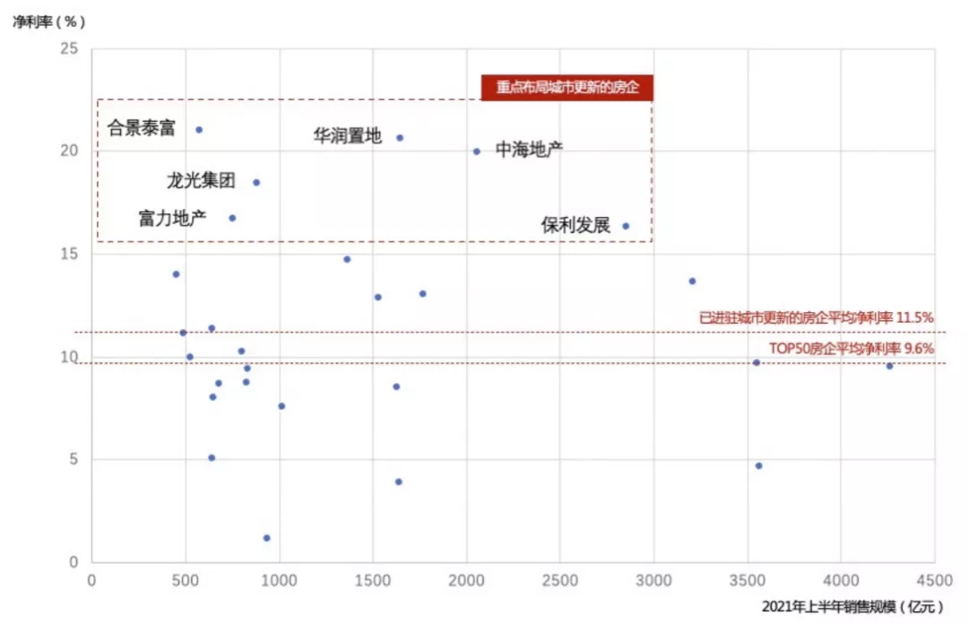 其中重點布局城市更新業務的5家房企,包括龍光、富力、華潤、中海、合景泰富,2021年上半年凈利率皆在16%以上,遠高于行業平均凈利率9.6%。