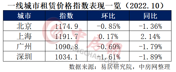 近日,由易居企業(yè)集團(tuán)、上海易居房地產(chǎn)研究院、華東師范大學(xué)東方房地產(chǎn)研究院三方共同發(fā)布的《中國(guó)城市住房租賃價(jià)格指數(shù)報(bào)告》顯示,2022年10月,中國(guó)城市租賃價(jià)格指數(shù)為1022.5點(diǎn),較上月下降5.2點(diǎn),環(huán)比下跌0.50%,同比跌幅1.04%。