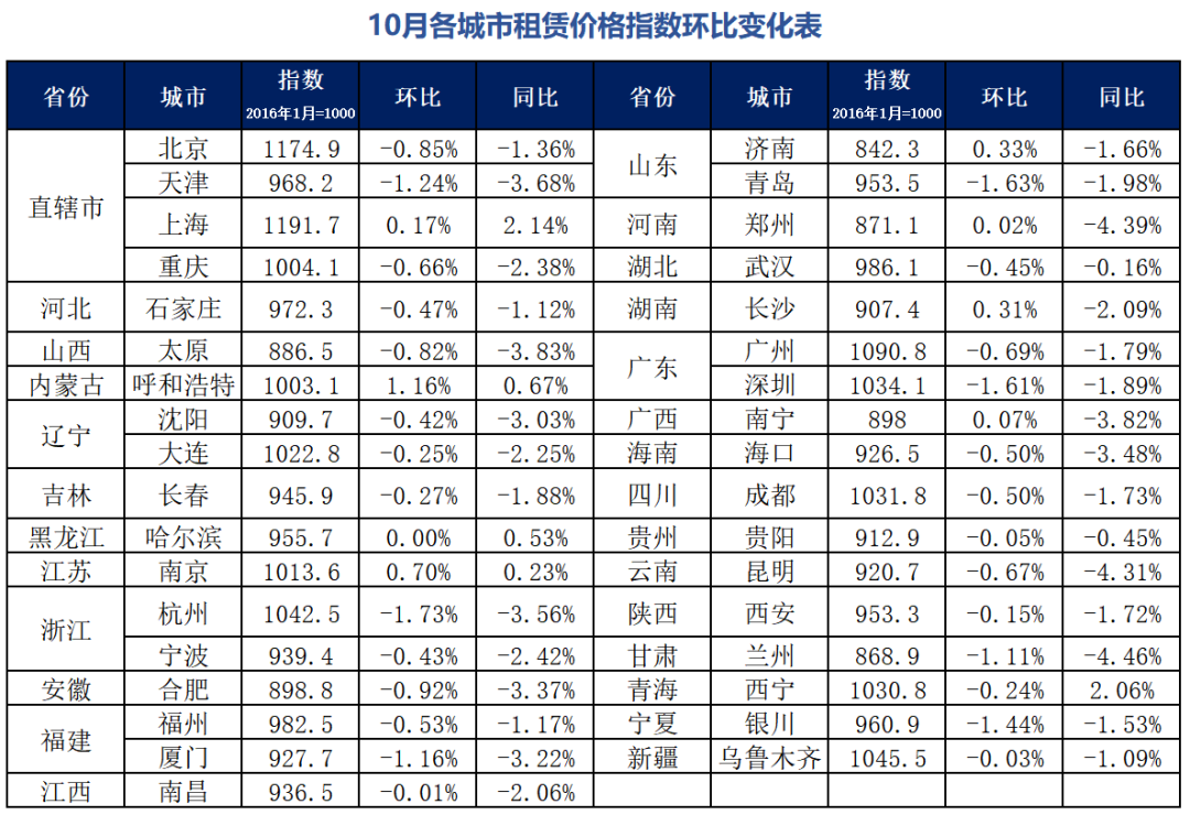 從環(huán)比方面看,監(jiān)控的35個(gè)城市中,呼和浩特(1.16%)、南京(0.70%)、濟(jì)南(0.33%)、長(zhǎng)沙(0.31%)、上海(0.17%)、南寧(0.07%)和鄭州(0.02%)7個(gè)城市租賃價(jià)格指數(shù)出現(xiàn)上漲,上漲城市數(shù)量比9月份增加5個(gè)。有27個(gè)城市(南昌、烏魯木齊、貴陽(yáng)、西安、西寧、大連、長(zhǎng)春、沈陽(yáng)、寧波、武漢、石家莊、海口、成都、福州、重慶、昆明、廣州、太原、北京、合肥、蘭州、廈門(mén)、天津、銀川、深圳、青島、杭州)租賃價(jià)格指數(shù)出現(xiàn)不同程度下跌,下跌城市數(shù)量比9月份減少5個(gè)。其中,杭州(-1.73%)、青島(-1.63%)和深圳(-1.61%)跌幅靠前,且跌幅均超1.6%。除此之外,僅哈爾濱1個(gè)城市租賃價(jià)格指數(shù)與9月份持平,且該城市租賃價(jià)格指數(shù)已連續(xù)兩個(gè)月呈持平態(tài)勢(shì)。