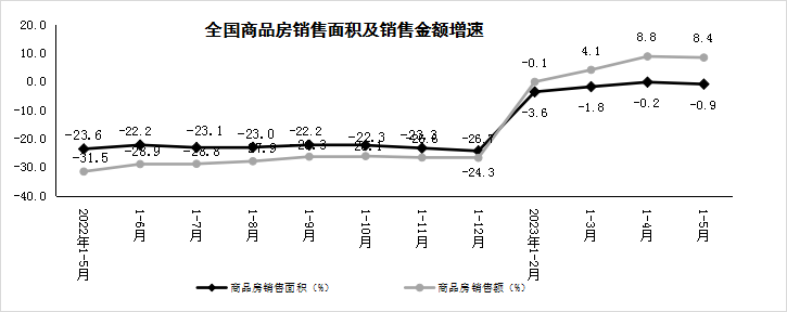 1—5月,全國商品房銷售面積46440萬平方米,同比下降0.9%,其中住宅銷售面積增長2.3%。商品房銷售額49787億元,增長8.4%,其中住宅銷售額增長11.9%。