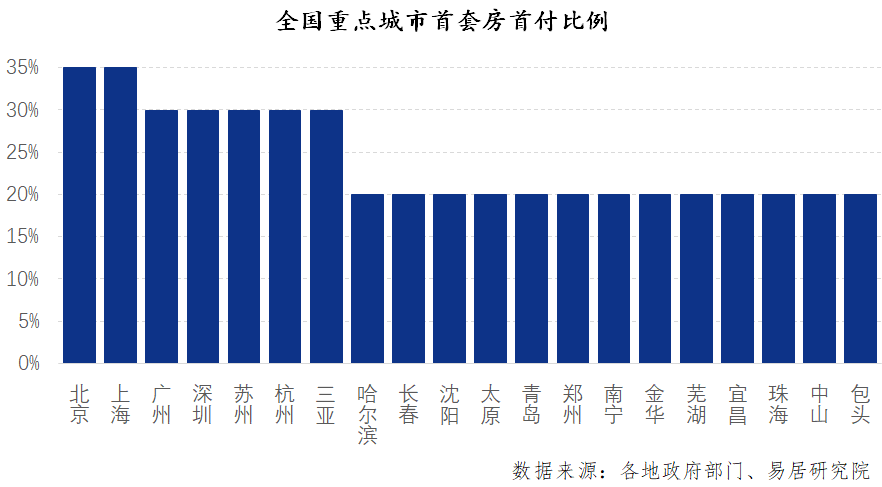 根據易居研究院監測,目前全國20個重點城市首套房首付比例平均值為24%,首付比例主要分為35%、30%和20%三檔。