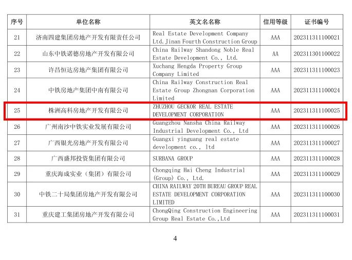 近日,中國房地產(chǎn)業(yè)協(xié)會(huì)公布了《2023年房地產(chǎn)開發(fā)企業(yè)信用評價(jià)等級結(jié)果》。2023年全國房地產(chǎn)開發(fā)企業(yè)獲得信用評價(jià)等級共有42家。在湖南省房地產(chǎn)業(yè)協(xié)會(huì)的組織和推薦下,株洲高科房地產(chǎn)開發(fā)有限公司獲得信用評價(jià)AAA等級。