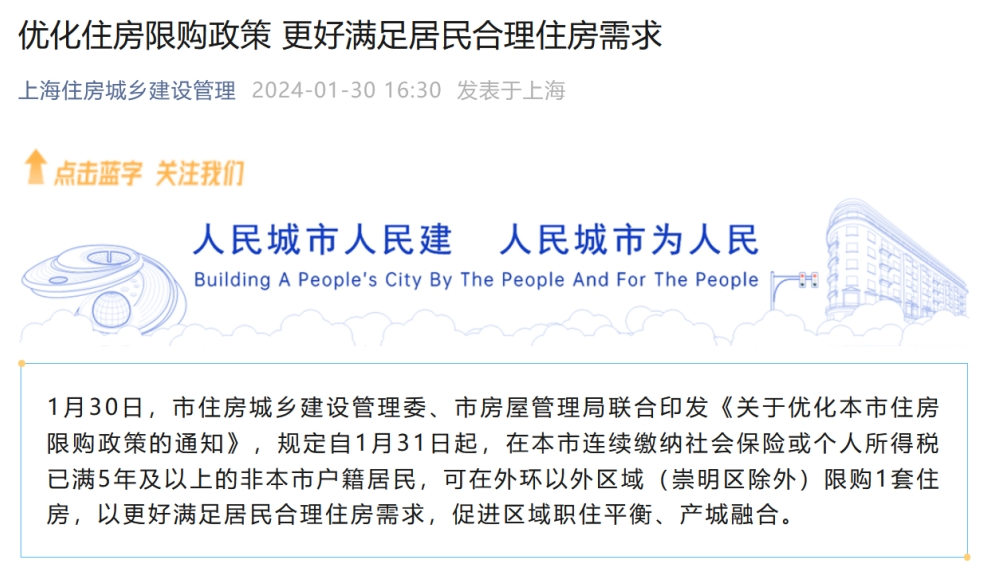 1月30日,上海市住建委、市房管局聯(lián)合印發(fā)通知,對住房限購政策進行優(yōu)化。通知規(guī)定,自1月31日起,在上海市連續(xù)繳納社會保險或個人所得稅已滿5年及以上的非本市戶籍居民,可在外環(huán)以外區(qū)域(崇明區(qū)除外)限購1套住房。