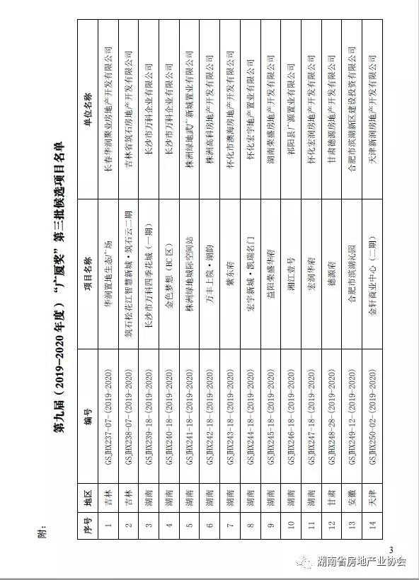 依據“廣廈獎”管理辦法和評價標準,經企業申報,“廣廈獎”省級評選機構初審及推薦,“廣廈獎”評審專家組終審,“廣廈獎”評審委員會審定,并經公示等程序,湖南省有九個項目,列入第九屆“廣廈獎”第三批候選項目名單,獲得候選項目名單有長沙市萬科四季花城(一期)、金色夢想、株洲綠地城際空間站、萬豐上院·湖韻、紫東府、宏宇新城·凱瑞名門、益陽榮盛華府、湘江壹號、宏潤華府九個項目,希望湖南有更多的優秀項目參與廣廈獎申報,提升住房品質。