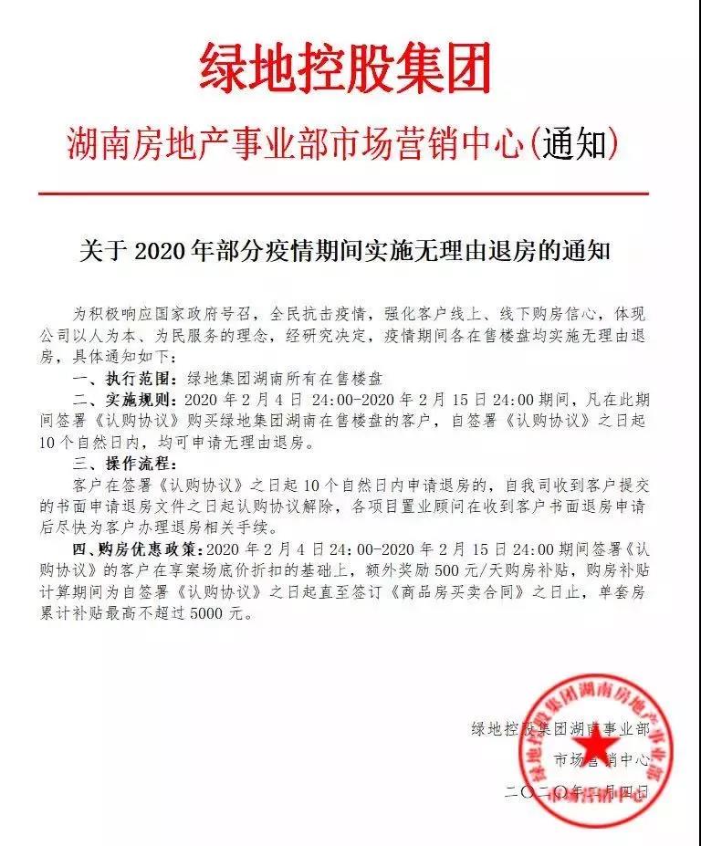 據(jù)路邊社消息,湖南綠地近日推出“無理由退房,每日500元補(bǔ)貼”政策,共同抗“疫”!
