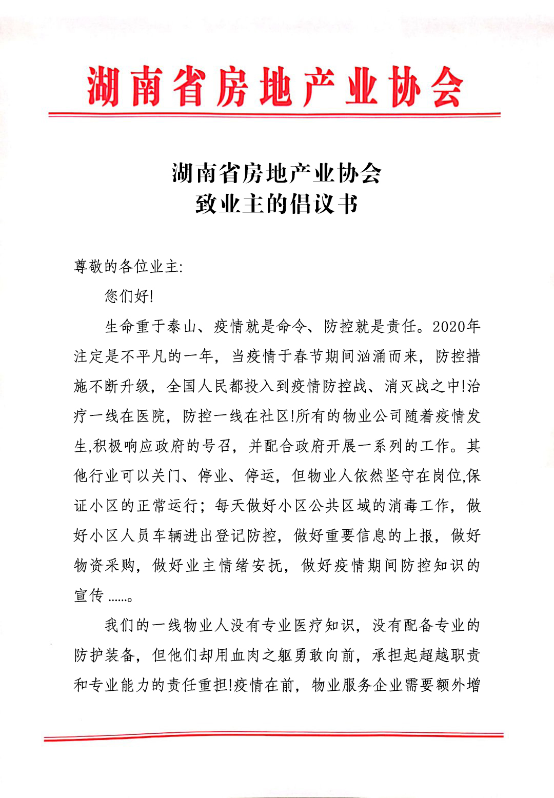 湖南省房地產(chǎn)業(yè)協(xié)會致業(yè)主的倡議書