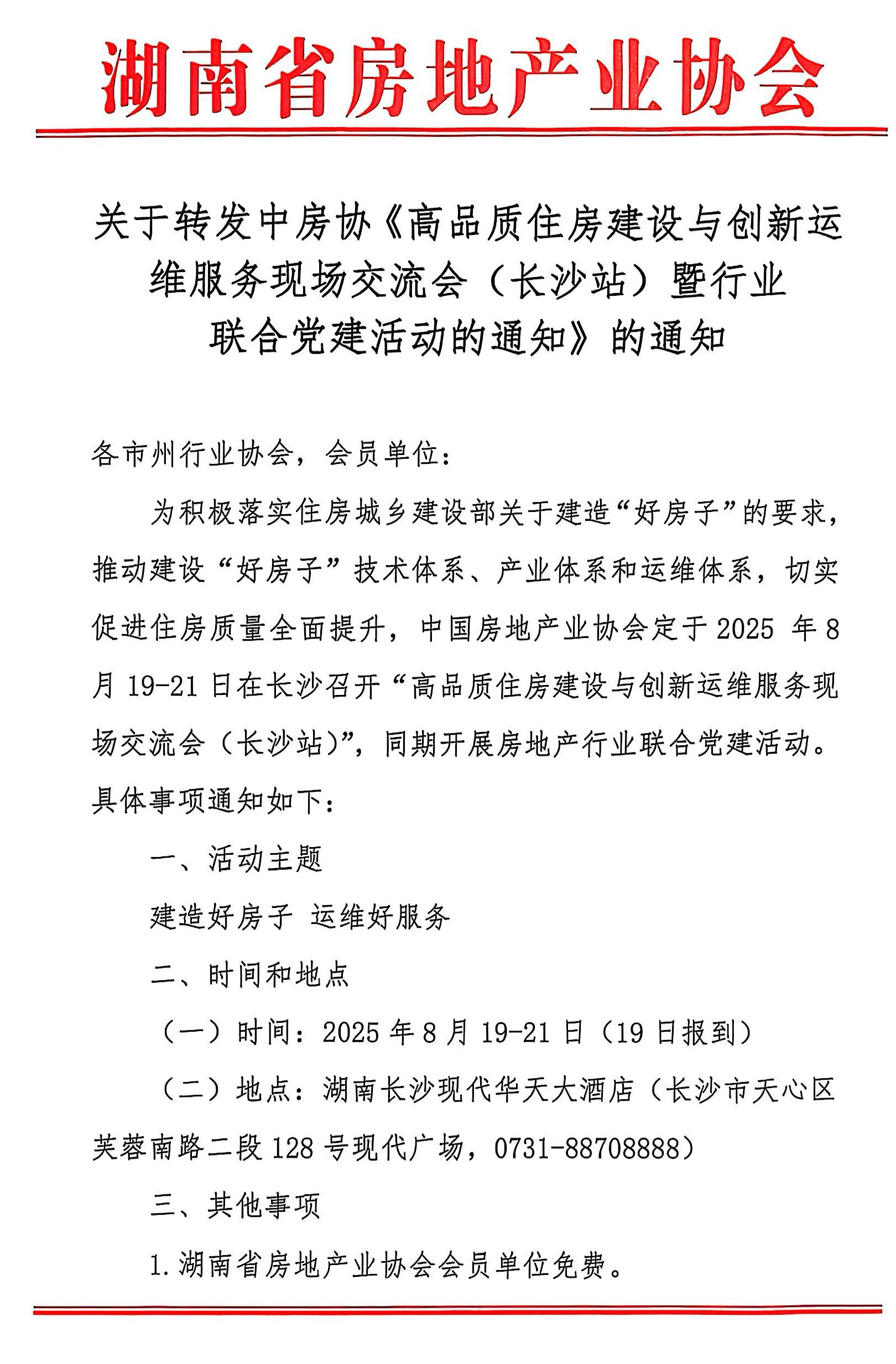 關(guān)于轉(zhuǎn)發(fā)中房協(xié)《高品質(zhì)住房建設(shè)與創(chuàng)新運維服務(wù)現(xiàn)場交流會(長沙站)暨行業(yè)聯(lián)合黨建活動的通知》的通知