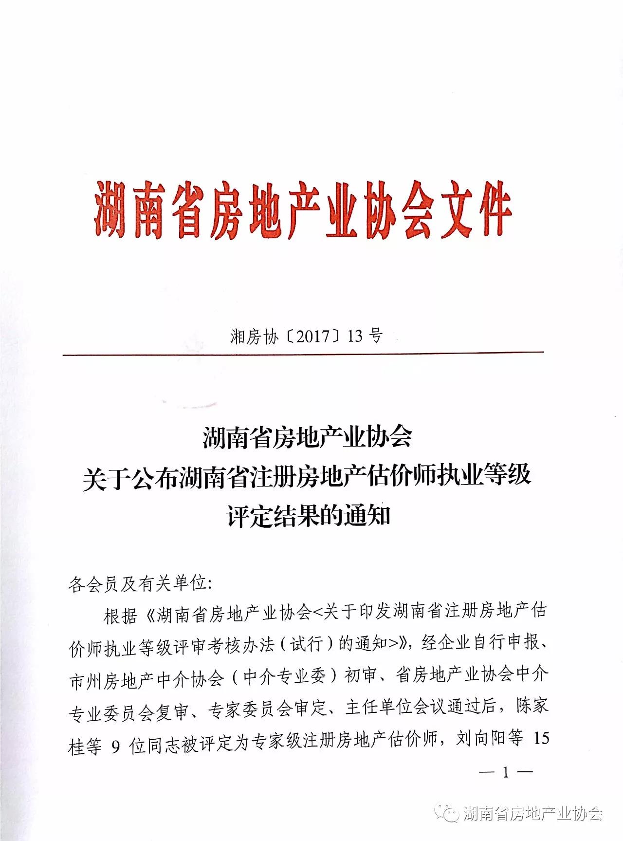 湖南省房地產(chǎn)業(yè)協(xié)會(huì)關(guān)于公布湖南省注冊(cè)房地產(chǎn)估價(jià)師執(zhí)業(yè)等級(jí)評(píng)定結(jié)果的通知