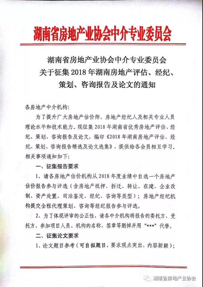 關于征集2018年湖南房地產評估、經紀、 策劃、咨詢報告及論文的通知