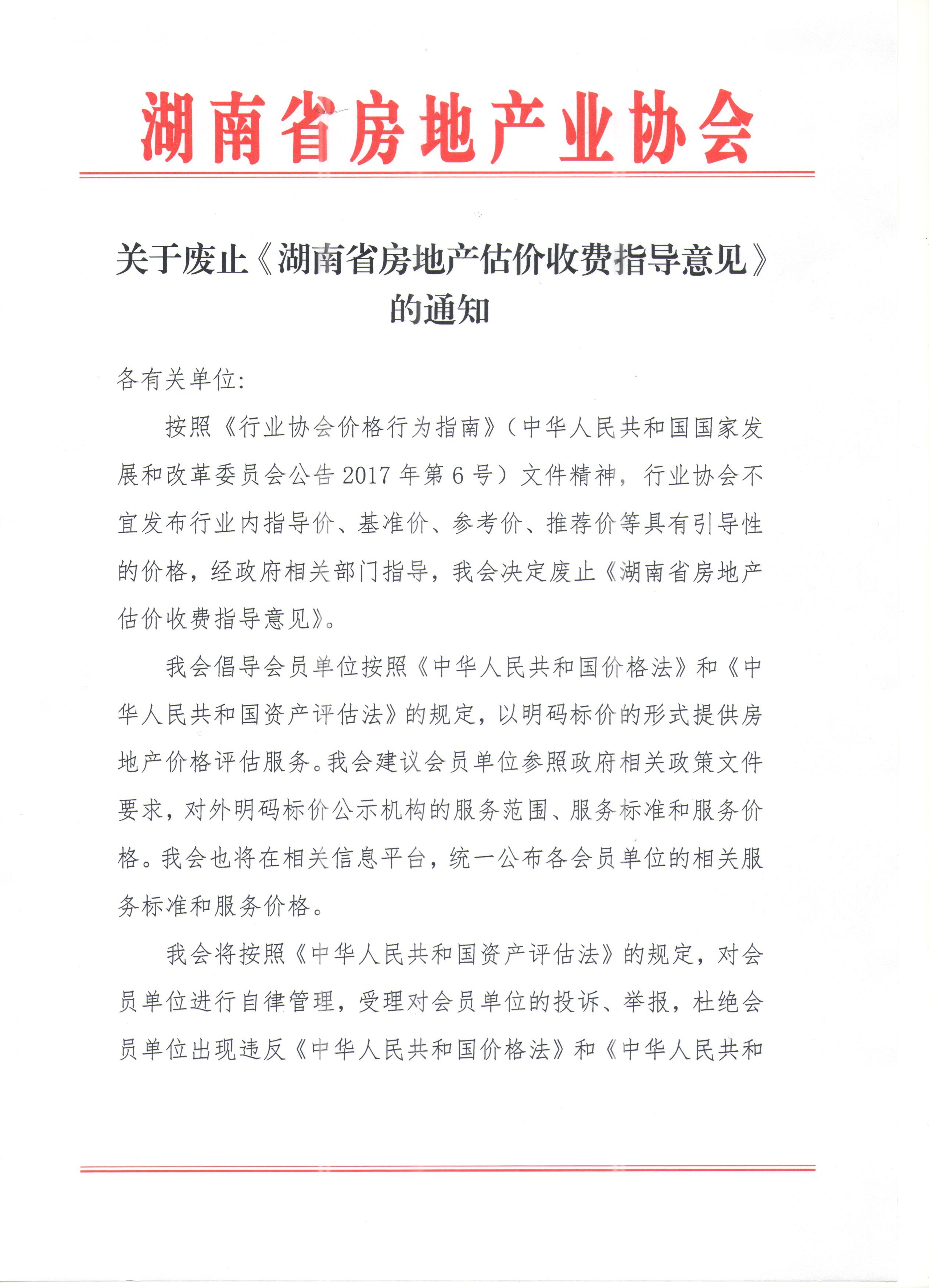 關于廢止《湖南省房地產估價收費指導意見》的通知