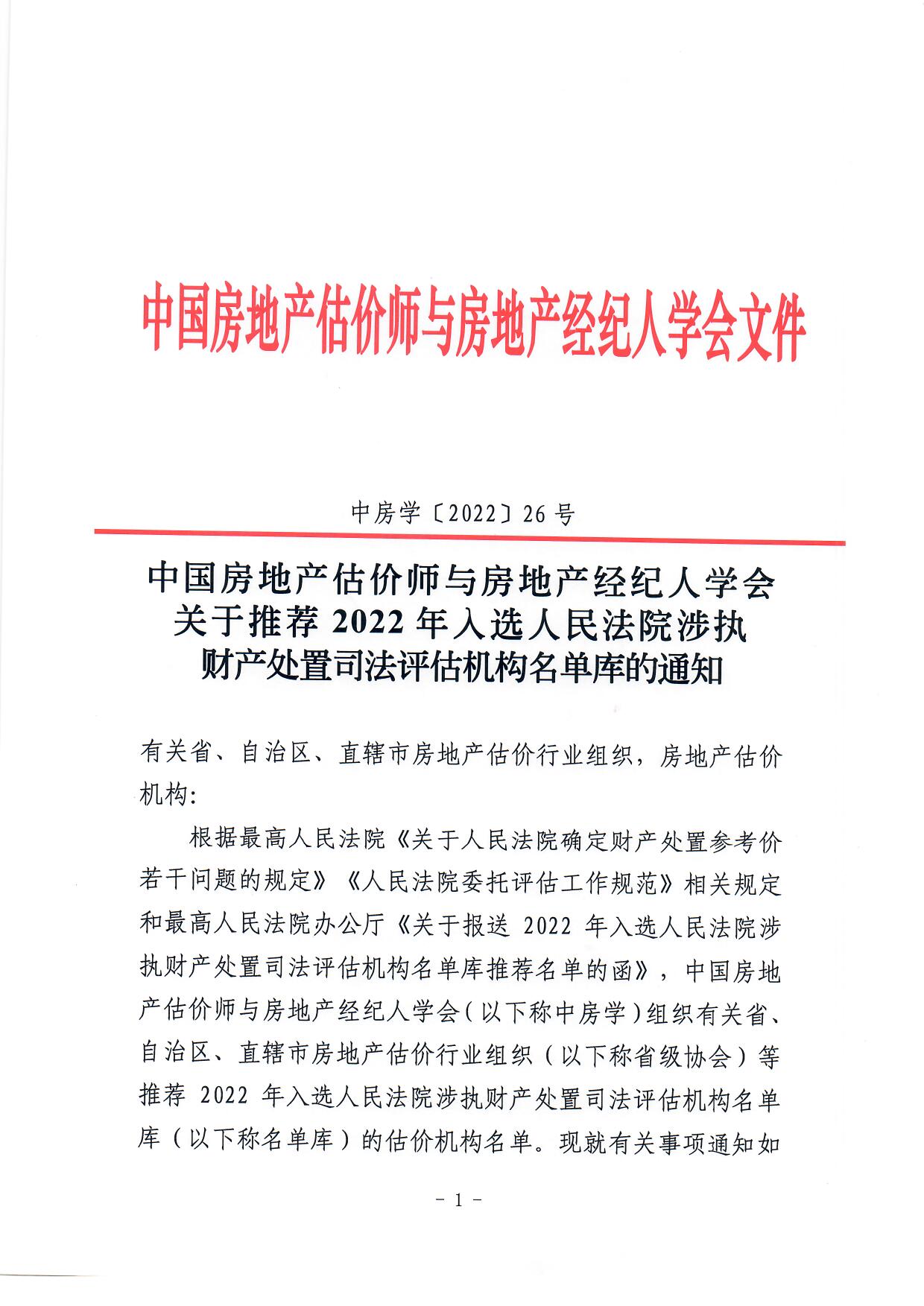 轉(zhuǎn)發(fā)中房學(xué)《關(guān)于推薦2022年入選人民法院涉執(zhí)財(cái)產(chǎn)處置司法評(píng)估機(jī)構(gòu)名單庫(kù)的通知》