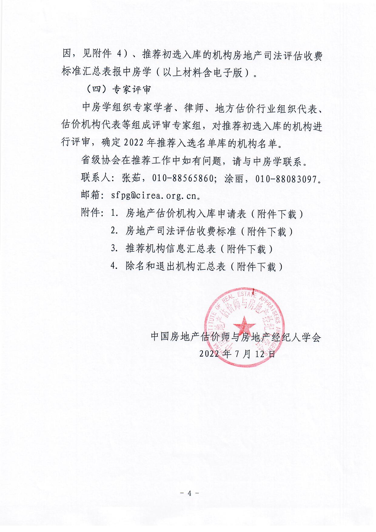 為配合中房學(xué)做好司法評(píng)估業(yè)務(wù)的房地產(chǎn)估價(jià)機(jī)構(gòu)名單庫(kù)推選工作,現(xiàn)將中國(guó)房地產(chǎn)估價(jià)師與房地產(chǎn)經(jīng)紀(jì)人學(xué)會(huì)《關(guān)于推薦2022年入選人民法院涉執(zhí)財(cái)產(chǎn)處置司法評(píng)估機(jī)構(gòu)名單庫(kù)的通知》(中房學(xué)〔2022〕26號(hào)),轉(zhuǎn)發(fā)給各有關(guān)單位并將有關(guān)事項(xiàng)補(bǔ)充如下: