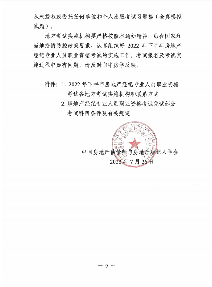附件:中國房地產估價師與房地產經紀人學會關于2022年下半年房地產經紀專業人員職業資格考試有關問題的通知