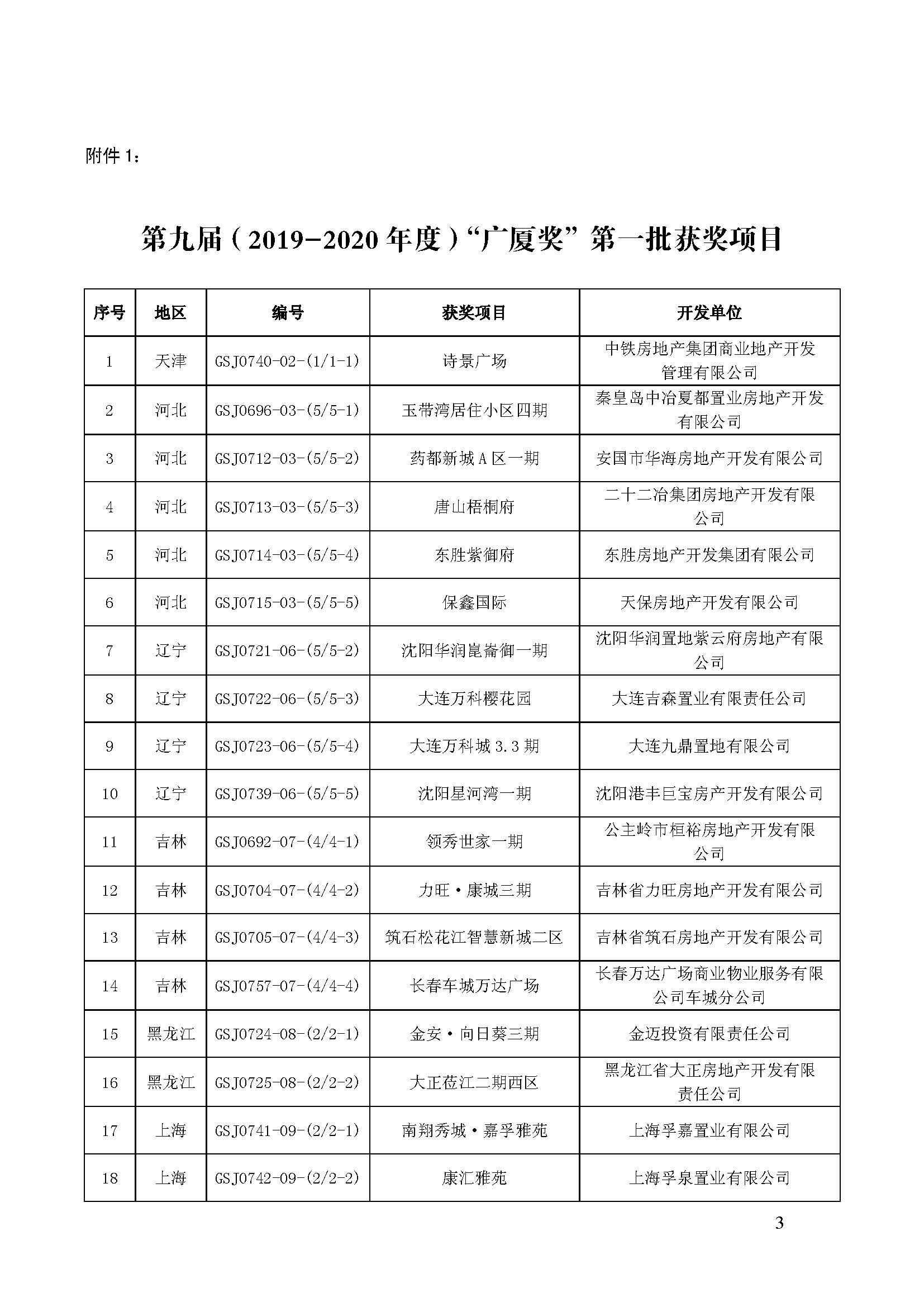 (附:關于表彰第九屆(2019—2020年度)“廣廈獎”第一批獲獎項目的通報)