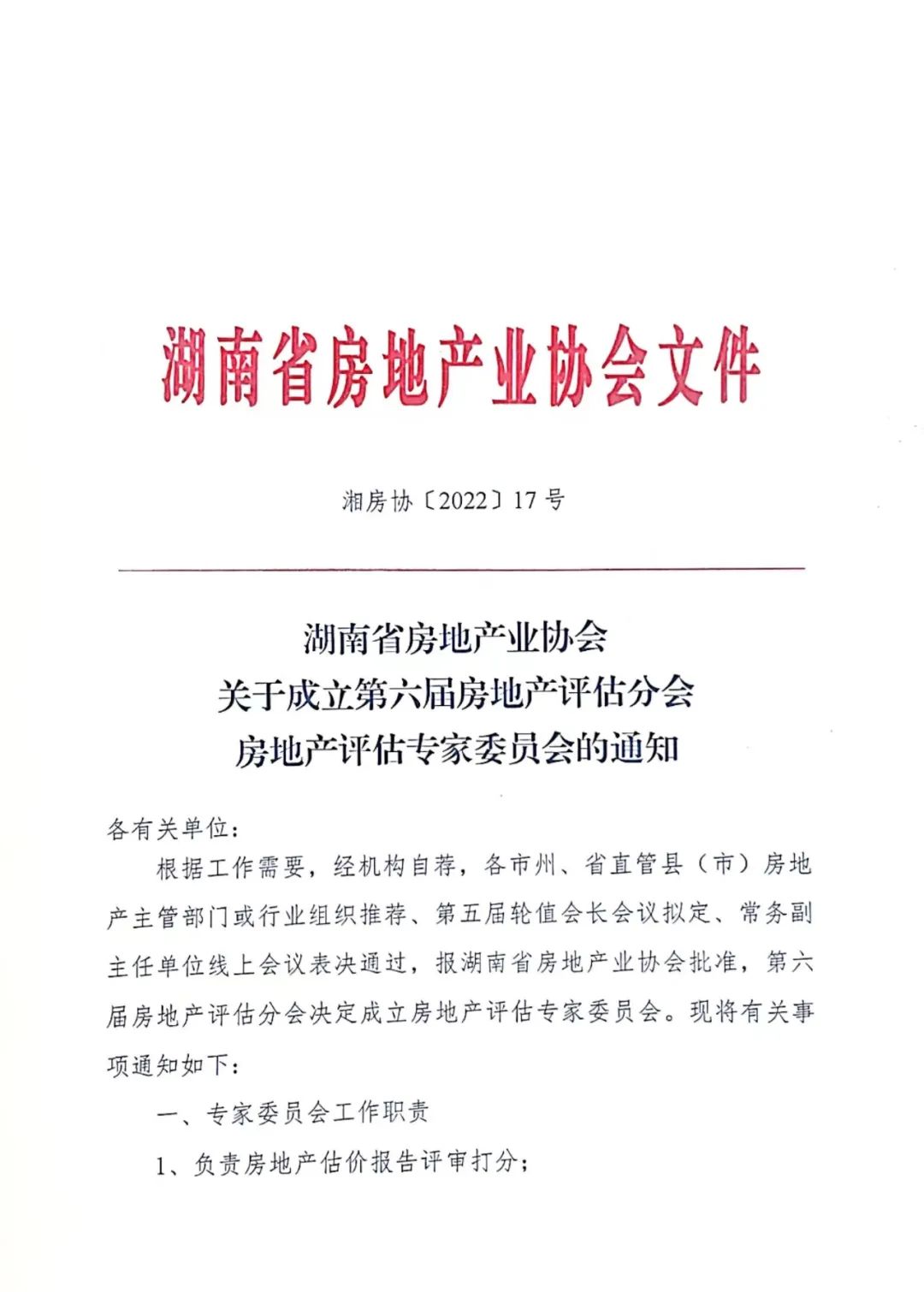 根據工作需要,經機構自薦,各市州、省直管縣(市)房地產主管部門或行業組織推薦、第五屆輪值會長會議擬定、常務副主任單位線上會議表決通過,報湖南省房地產業協會批準,第六屆房地產評估分會決定成立房地產評估專家委員會?,F將有關事項通知如下: